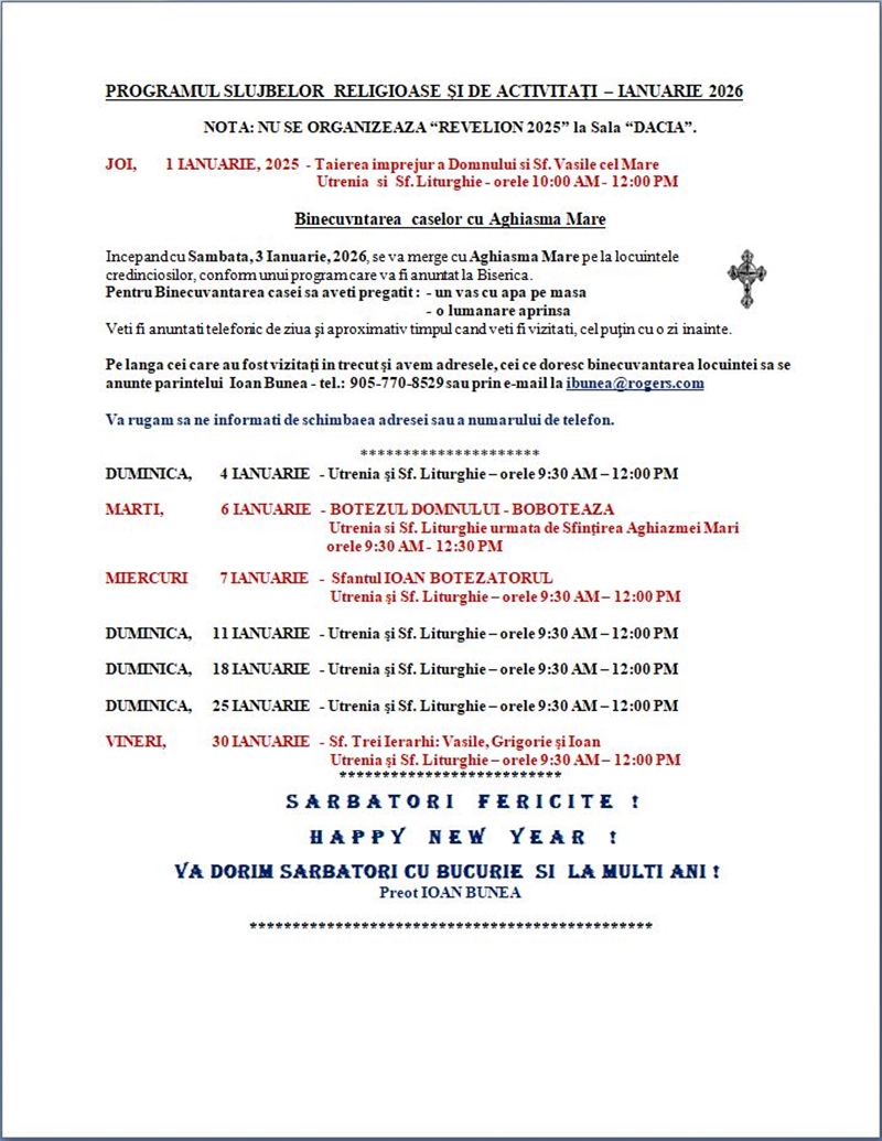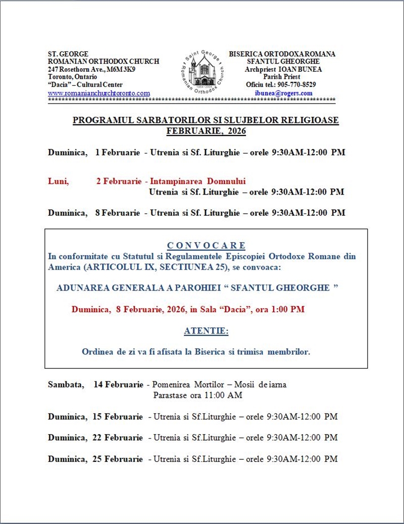 ©1999- Biserica Ortodoxă Română Sfântul Gheorghe - Toronto Ultima actualizare: 1 Decembrie 2025 |